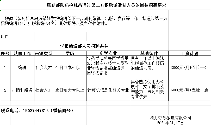 联勤部队药检总站通过第三方招聘派遣制人员的岗位招募要求